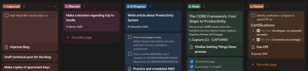 J’utilise ici les attributs des pages Notion: deadline, status, catégories, ainsi que les notes pour ajouter du contexte à l’unité de travail. Les colonnes du Kanban correspondent au statut de l’unité de travail : capturée, planifiée, en cours, réalisée et en réserve.